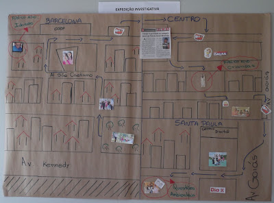 Terminamos a montagem do Mapa de Roteiro do grupo, com ilustrações e sinalização de nossa rota, desde o momento em que iniciamos a experiência, até passarmos pelo centro de São Caetano do Sul e pela praça Di Thiene, que se localiza perto da livraria C'zar, que foi uma das parceiras.